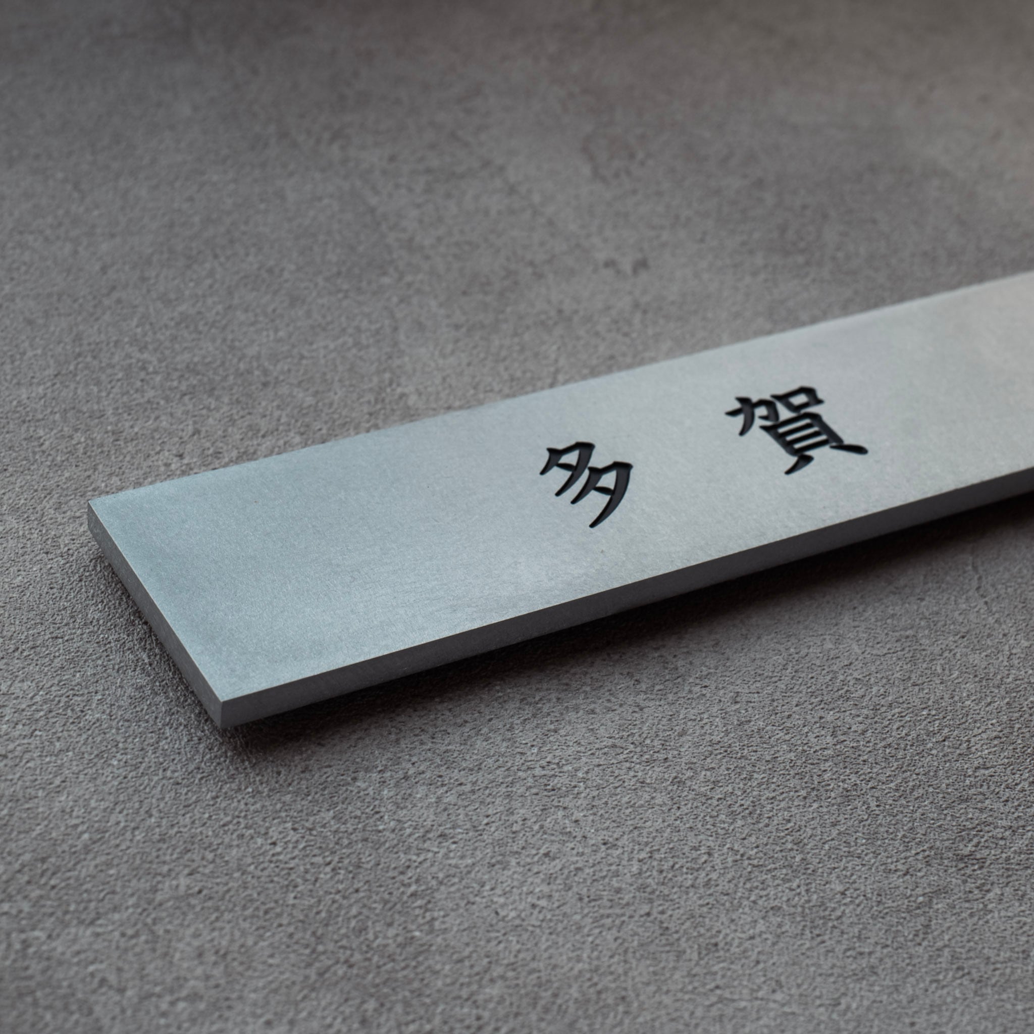 そのため他の加工方法と違い、近くで見た際の文字部周辺のボソボソとした滲みが無く、彫金加工特有の文字の稜線がはっきりとし、文字部の陰影が際立った意匠性と高級感のある仕上がりとなっています。
